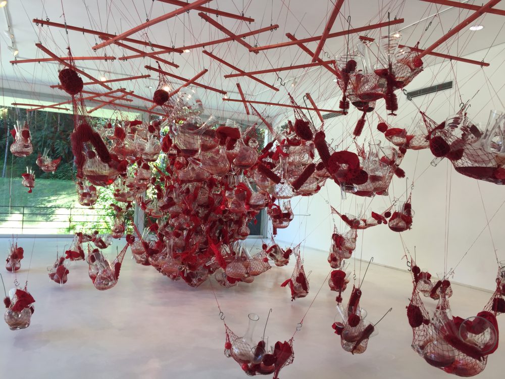 Galeria Adriana Varejão: observar esta edificação em meio a toda a natureza que a cerca, já valeu a visita. A arquitetura com linhas retas e muito concreto aparente, às margens de um espelho d’água deixam esta galeria entre uma das mais belas de Inhotim. Entre as obras que ali estão, é possível observar a da artista Linda do Rosário, onde paredes brancas quebradas, estão recheadas de vísceras vermelhas. No segundo andar, a obra “Celacanto Provoca Maremoto” é uma referência histórica ao barroco e a azulejaria portuguesa. No terraço é possível observar a obra “Passarinhos –de Inhotim a Demini”, onde traz vários tipos de pássaros estampados nos azulejos. São obras que te provocam diferentes sensações, vale a visita. CÓDIGO NO MAPA: G7