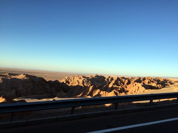 Saindo de San Pedro de Atacama, com destino à Calama, a paisagem é muito bonita. Já nos primeiros quilômetros passa-se pelo Vale de Marte (ou Vale de La Muerte), e o Vale dos dinossauros, onde a formação rochosa faz lembrar uma fila de dinossauros. Se parece eu não sei, mas é bonito.