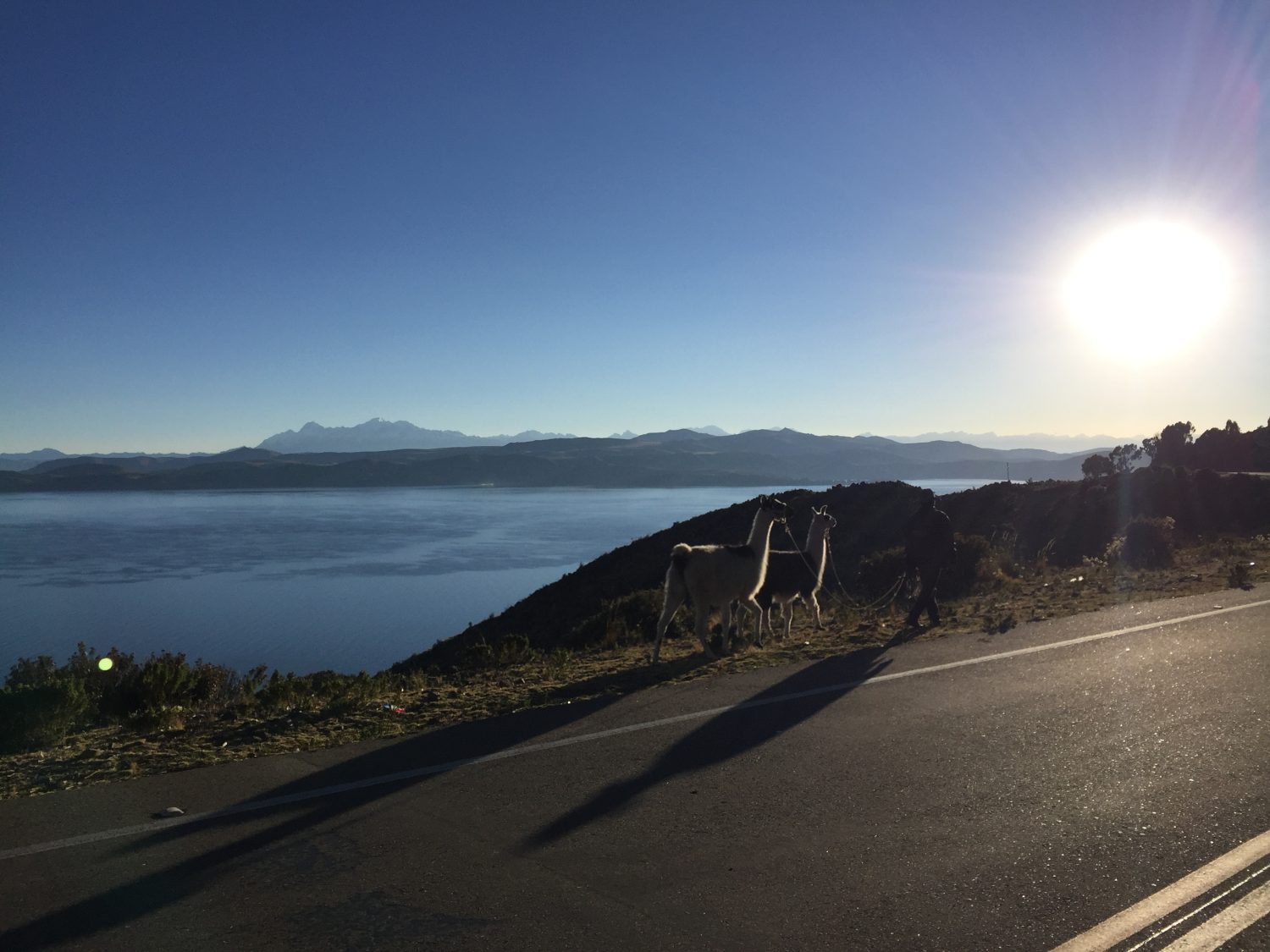 O trecho até o estreito foi um dos mais bonitos da viagem, ao nascer do sol, com o Lago Titicaca nos acompanhando. Estava frio e a estrada era muito bem conservada.