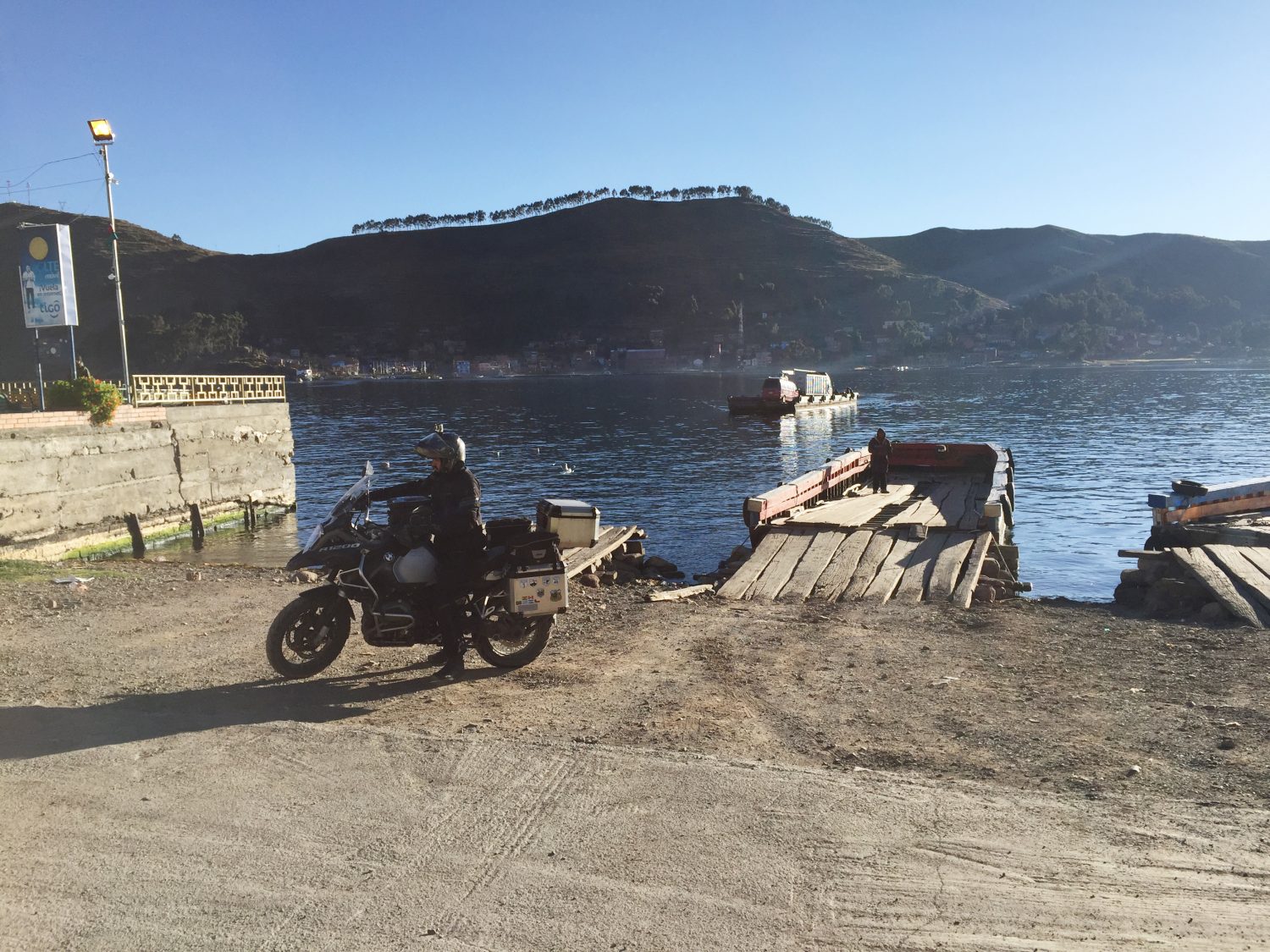 De Copacabana seguimos ate a cidade de San Pedro de Tiquina, onde há o estreito Tiquina para cruzar até o outro lado da margem. Não há outro meio de seguir viagem pela Bolívia. A única opção alternativa seria voltar ao Peru e dar uma volta enorme.
